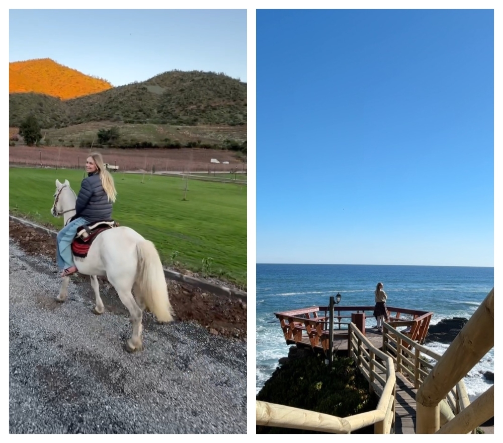 En la publicación se aprecia que paseó a caballo cerca de unas viñas y quedó fascinada con las vistas desde la playa de Boyeruca, en el Maule, un lugar al que llegó en helicóptero.