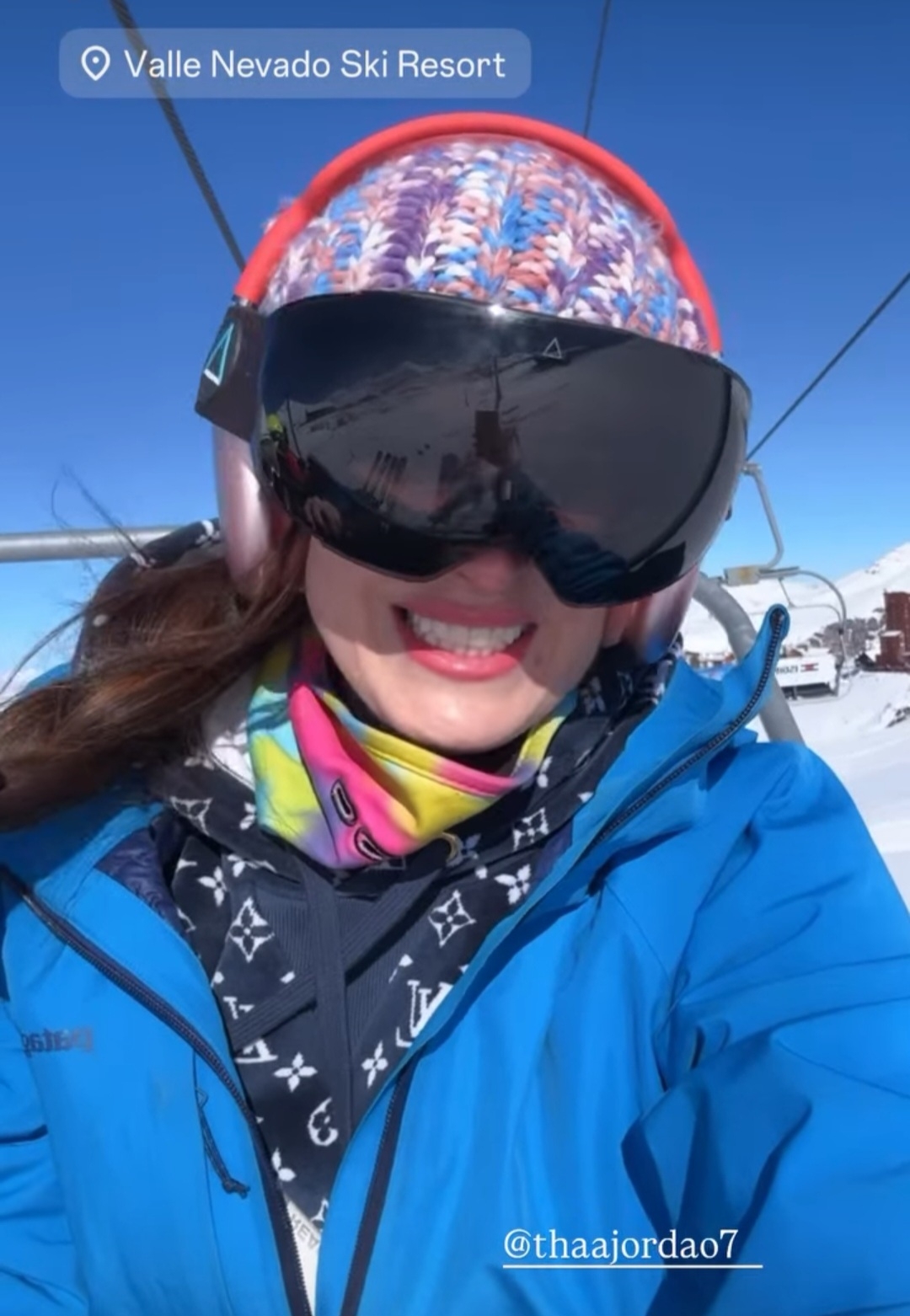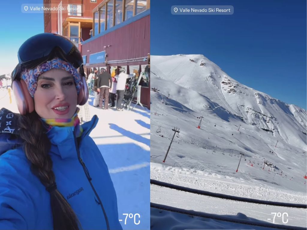 Desde el resort, estuvo abrigada ante los -7 grados que hacían, y sumó a su outfit de esquiar un gorro tejido en vibrantes colores pasteles -rosa, violeta y azul-, junto a unos lentes negros, que cubrió la mitad de su rostro y protegen a la perfección de las condiciones de nieve en la zona.