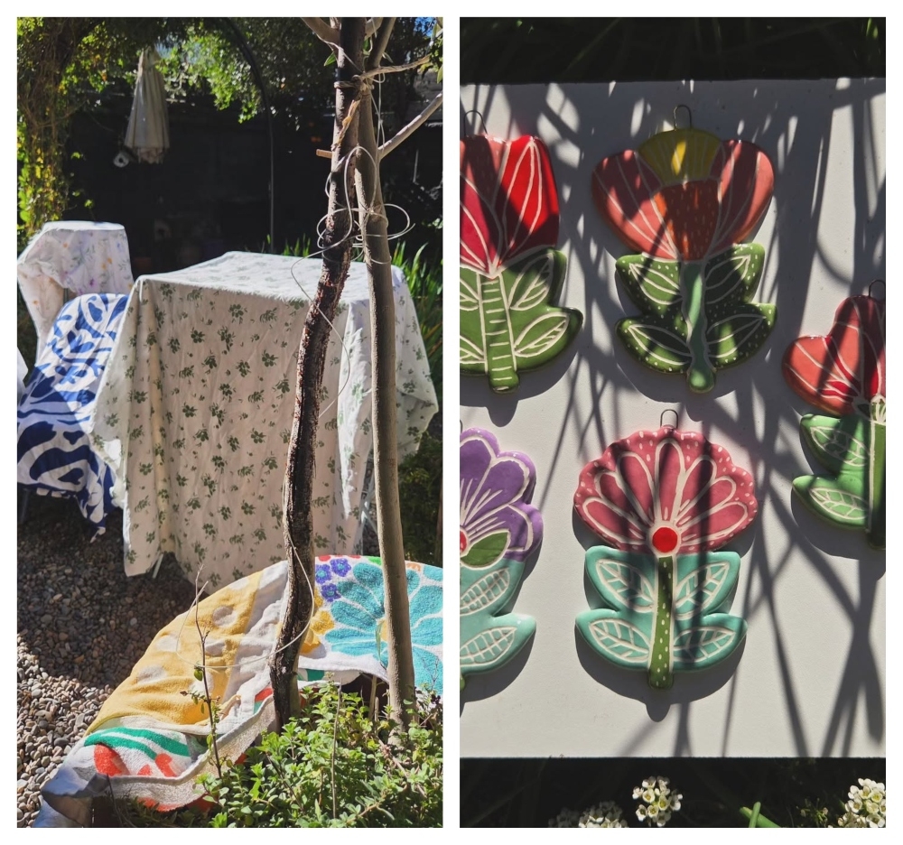 En el carrusel de fotos se aprecia que Achurra extendió algunos manteles en su mueblería para que se sequen, y otros materiales esenciales para su arte cerámico.