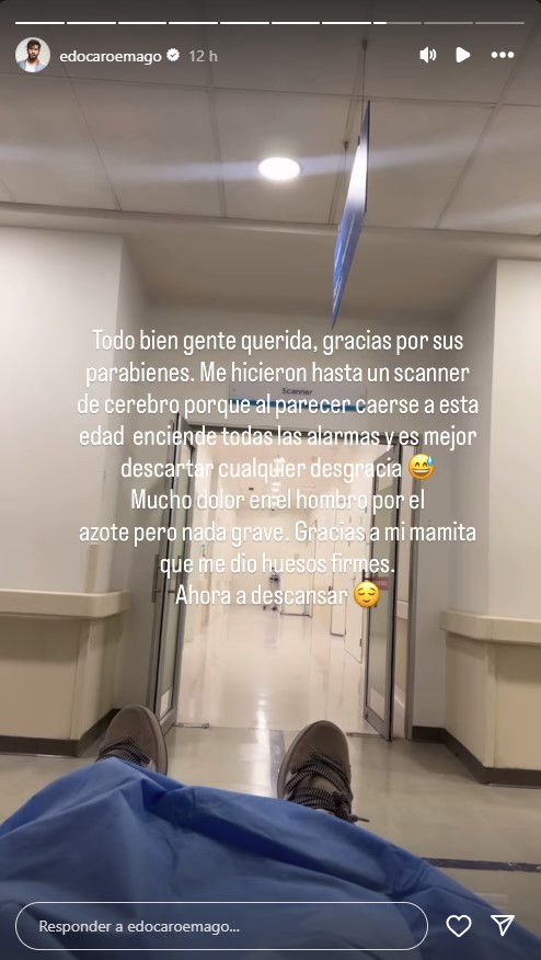 "Todo bien, mi gente querida, gracias por sus parabienes. Me hicieron hasta un scanner de cerebro porque al parecer caerse a esta edad enciende todas las alarmas y es mejor descartar cualquier desgracia. Mucho dolor en el hombro por el azote, pero nada grave. Gracias a mi mamita que me dio huesos firmes, ahora a descansar", cerró.