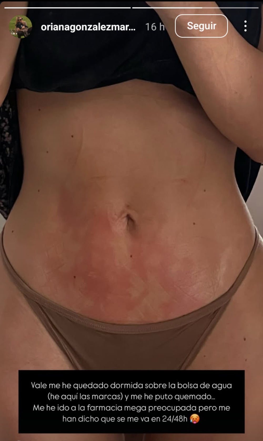 “Me he quedado dormida sobre la bolsa de agua caliente (he aquí las marcas) y me he quemado. Me he ido a la farmacia mega preocupada, pero me han dicho que se me va en 24 o 48 horas”, escribió.