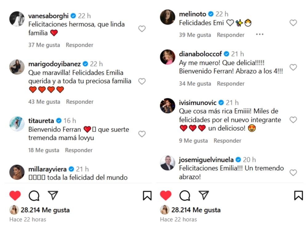 En medio de tanta alegría, decenas de famosos se sumaron a la celebración de Daiber. “Felicidades, hermosa. Qué linda familia”, escribió la modelo argentina Vanesa Borghi; mientras que la presentadora Tita Ureta comentó: “Bienvenido, Ferrán, qué suerte. Tremenda mamá”.