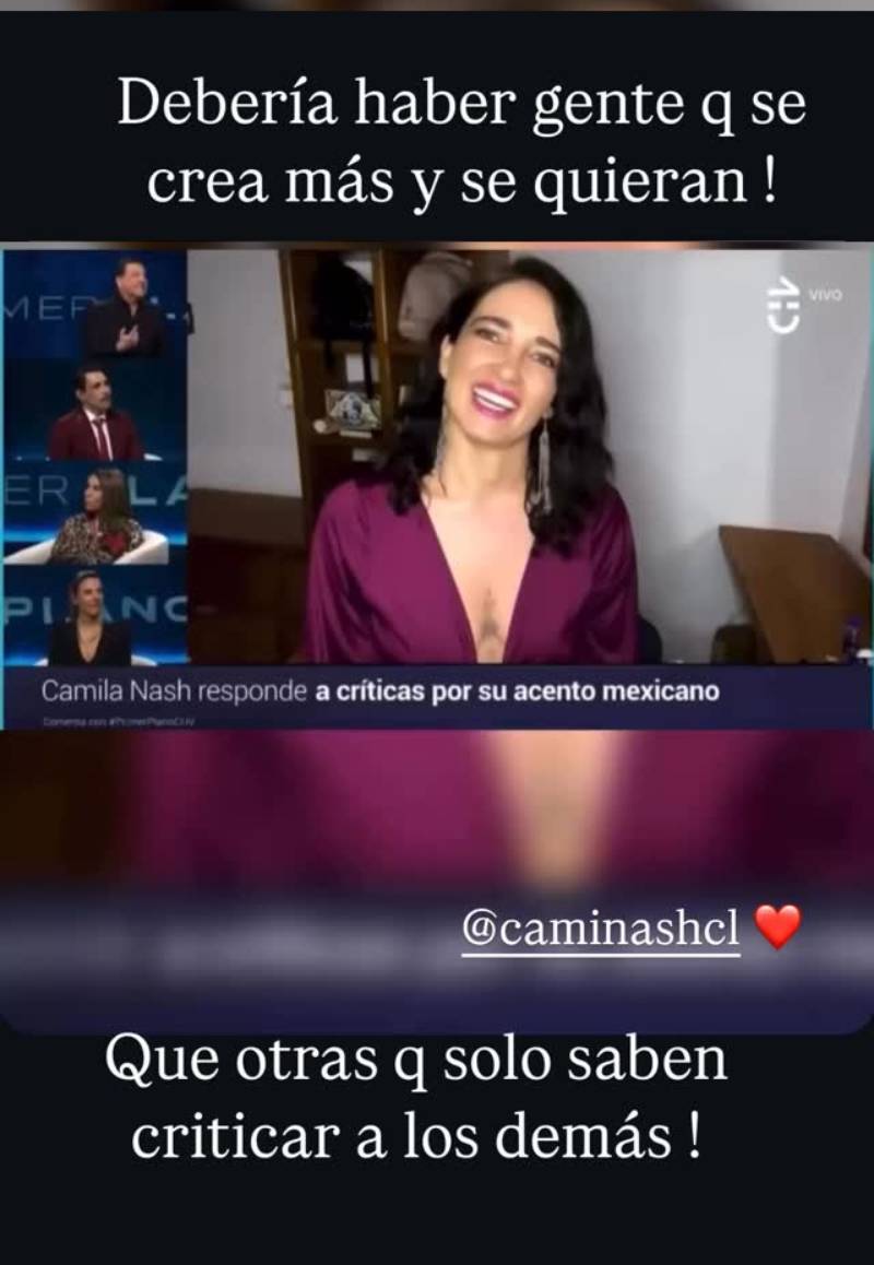 Cuevas compartió en una historia de Instagram una captura de la entrevista de Nash en CHV. "Debería haber más gente que se crea más y se quiera, que otras que solo saben criticar a los demás", escribió sobre la imagen la chica reality.