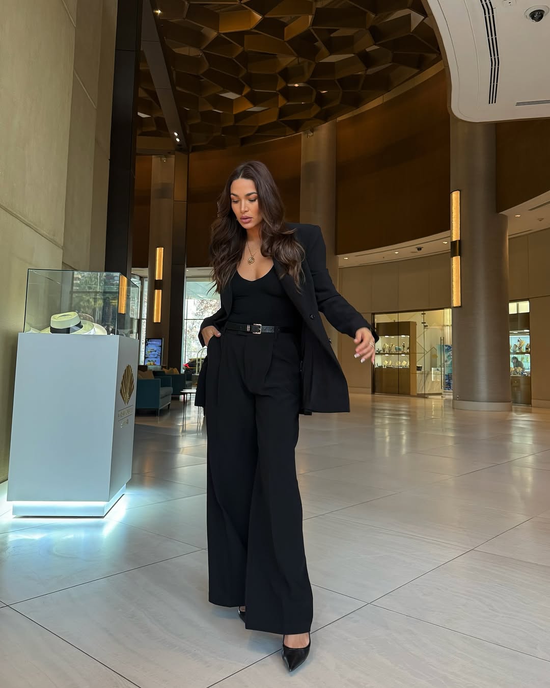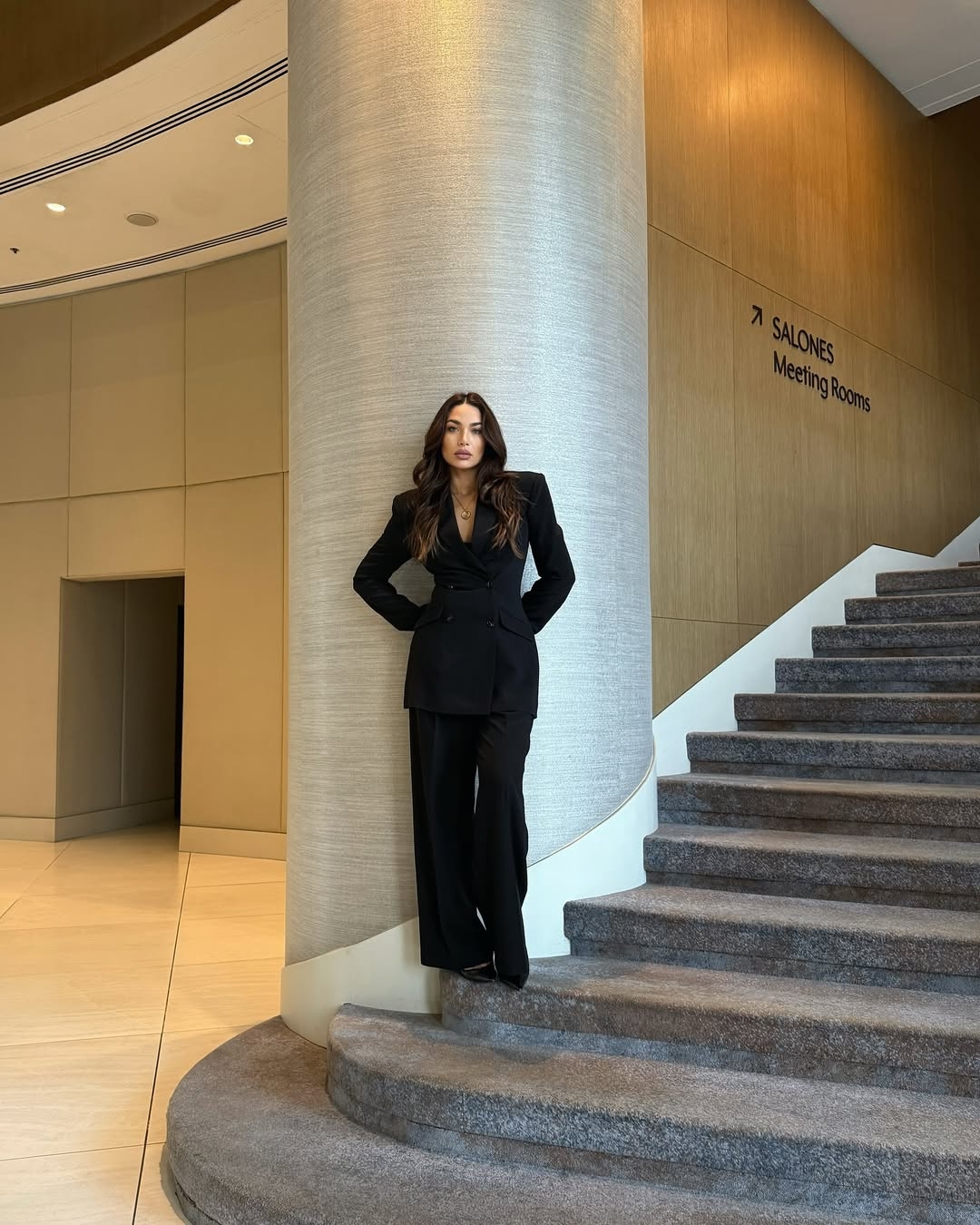 La apuesta infalible para una reunión de negocios: Lisandra Silva elige un look total black de sastrería