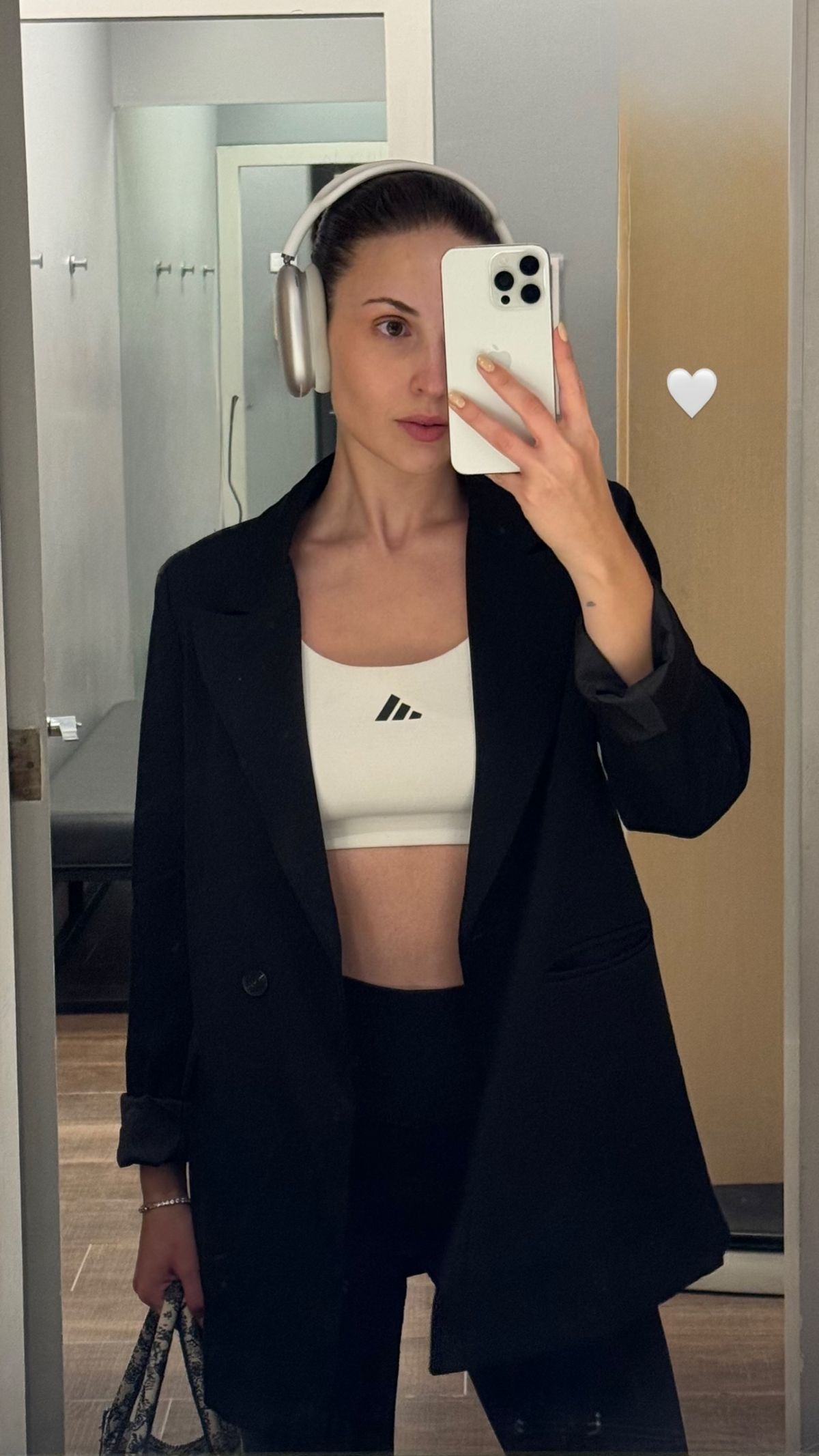 Belén Soto pasó por el espejo para mostrar su outfit, un top blanco de la marca Adidas que combinó con leggings negros y un blazer del mismo color, que llevó abierto.
