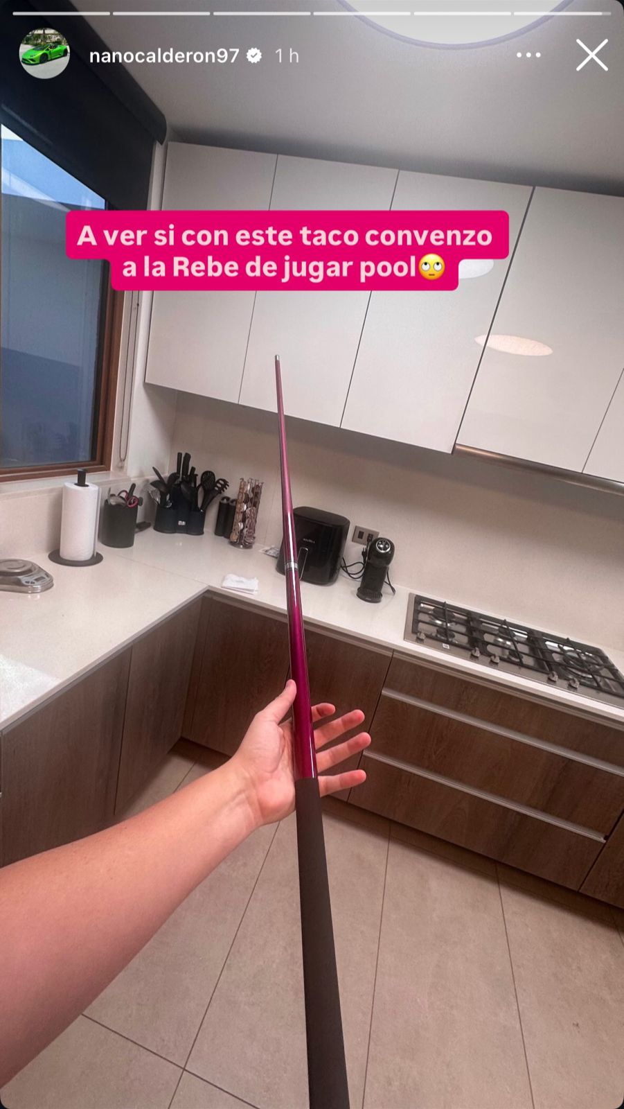 "A ver si con este taco convenzo a la Rebe de jugar pool", escribió el hermano de Kel Calderón, junto al implemento principal para practicar la disciplina, pero de color rosado.