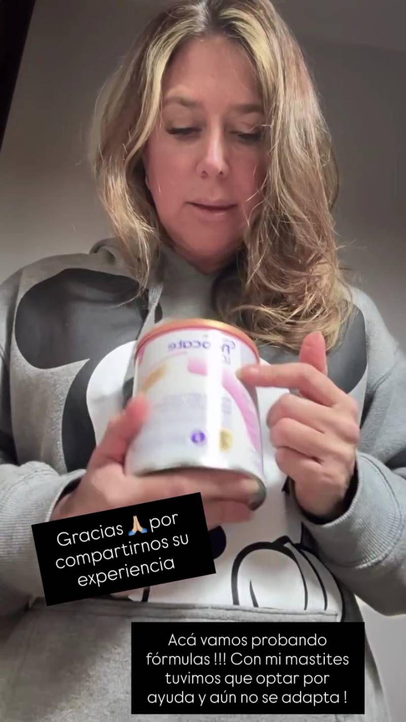 “Acá vamos probando fórmulas, con mi mastitis tuvimos que optar por ayuda y aún no se adapta”, mencionó, tras revelar que su hijo soportó horas de dolor y llanto. "Fueron dos días de llorar de noche, él es un bebé súper tranquilo", comentó antes de contar que, afortunadamente, encontró una marca que sigue en prueba y es más aceptada por su pequeño.