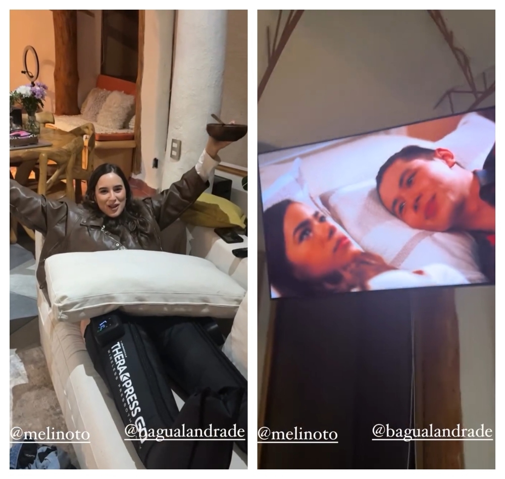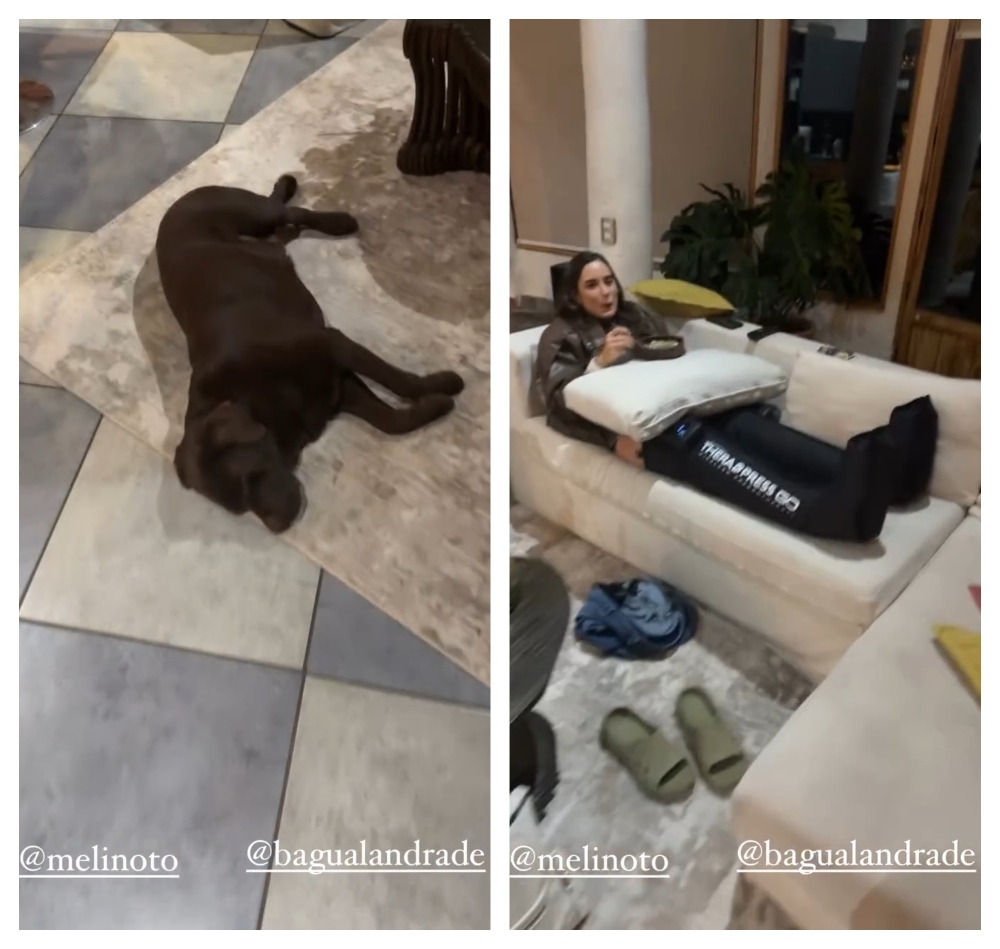 En el video se aprecia que Bagual se da su merecido descanso en el suelo, mientras que Melina está acostada en el sofá con unas botas de compresión para mejorar la circulación sanguínea, una terapia ideal para embarazadas.