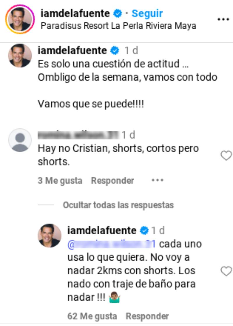 Una usuaria se fijó específicamente en el bañador de De la Fuente, y escribió: “Ay no, Cristián, usa short. Cortos, pero shorts”.