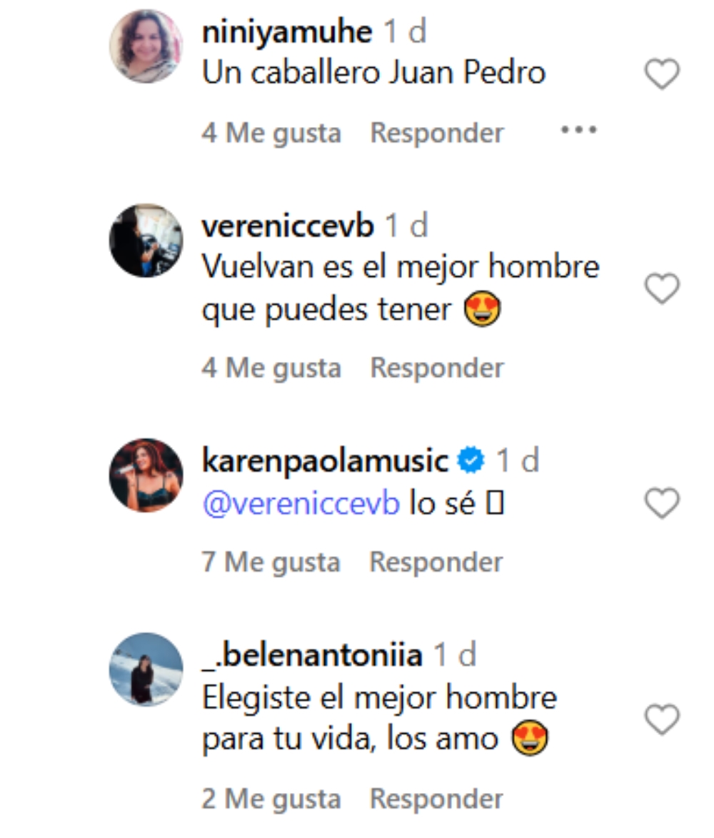 Posteriormente, una usuaria indicó su deseo de que Karen y Juan Pedro volvieran y consideró que el influencer es “el mejor hombre que puede tener”. La respuesta de la artista fue clara: “Lo sé”.