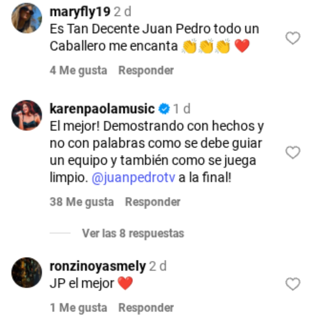 Ante las declaraciones de su expareja, Karen reconoció las habilidades de líder innato que el uruguayo posee. “El mejor. Demostrando con hechos y no con palabras como se debe guiar un equipo y también cómo se juega limpio. Juan Pedro a la final”, escribió.