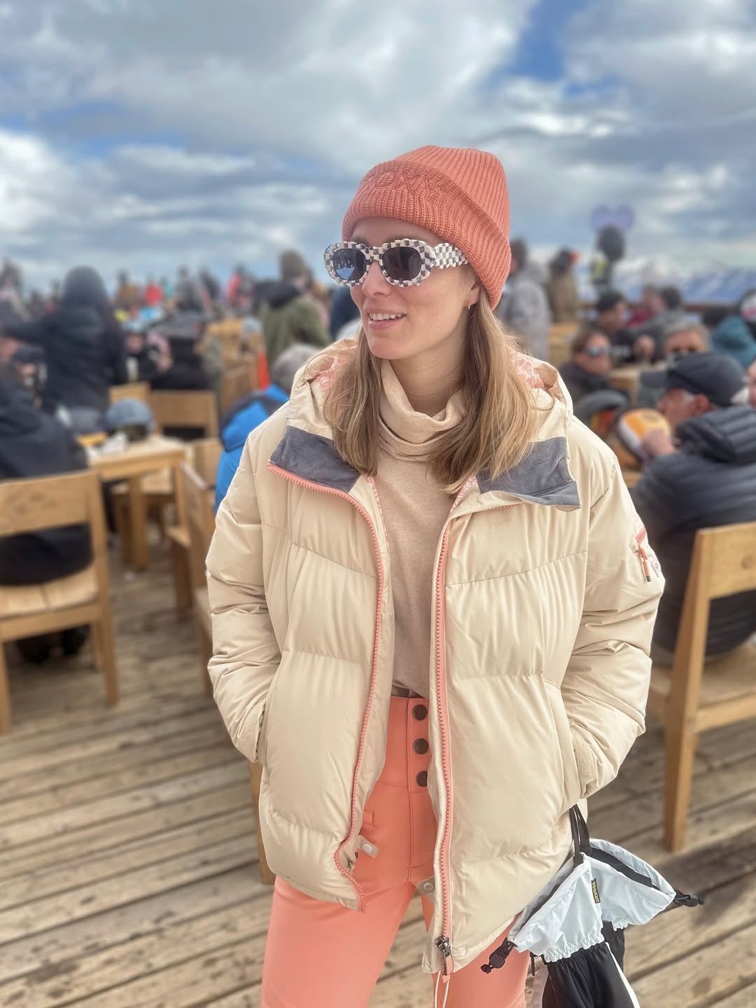 Esta prenda, la protagonista de su outfit, la llevó a juego con un pantalón y un gorro de lana tejido, ambos del mismo tono rosa salmón. Su look lo completó con lentes de sol de marco blanco y estampado de lunares negros, que le añadieron un toque divertido y fashionista.