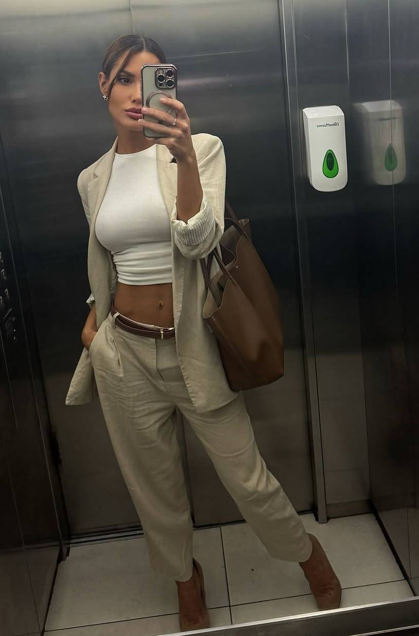 El segundo look representa otro gran acierto al verse auténtico, con un conjunto de lino beige compuesto por dos piezas. Se trata de un outfit working girl, de blazer versión largo, con solapas de pico y mangas adornadas.