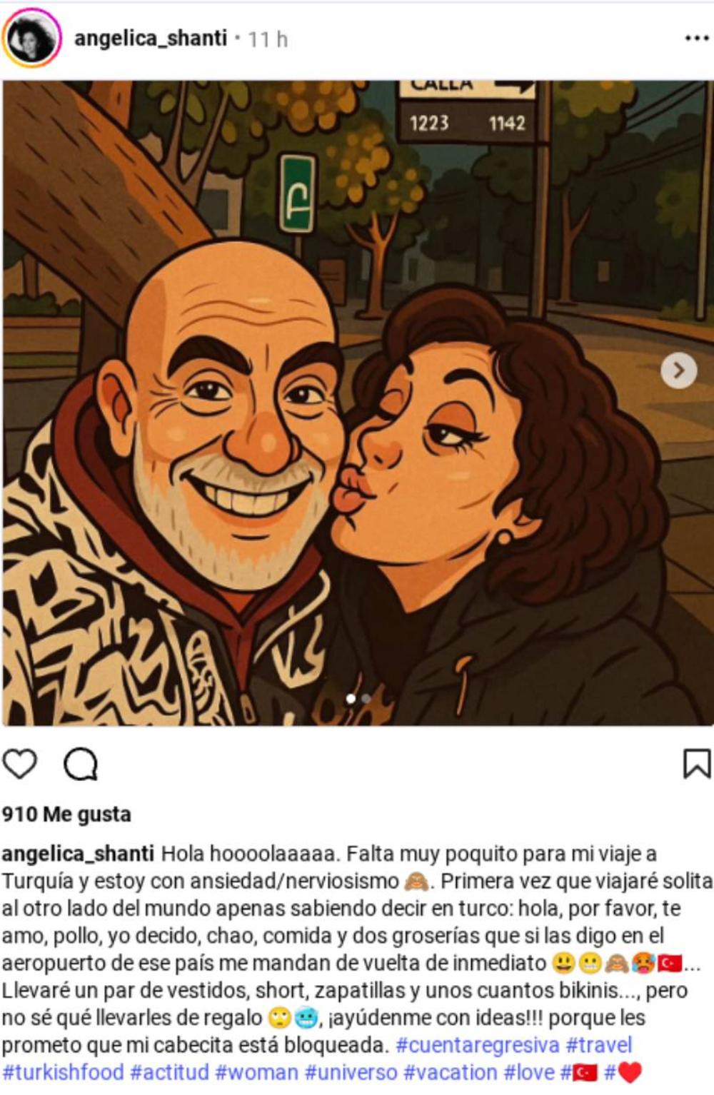 Angélica publicó en su cuenta de Instagram una imagen animada por inteligencia artificial de ella y Gursel, a partir de una foto real de ambos, y contó el motivo que no la deja dormir. “Falta muy poquito para mi viaje a Turquía y estoy con ansiedad/nerviosismo”, adelantó.