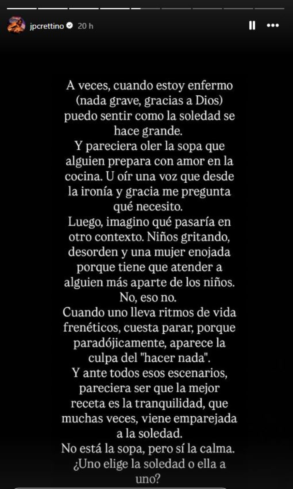 De esta manera reconoció que la paz es esencial para su estilo de vida. “Y ante todos esos escenarios, pareciera ser que la mejor receta es la tranquilidad, que muchas veces, viene emparejada a la soledad. No está la sopa, pero sí la calma. ¿Uno elige la soledad o ella a uno?”, concluyó.