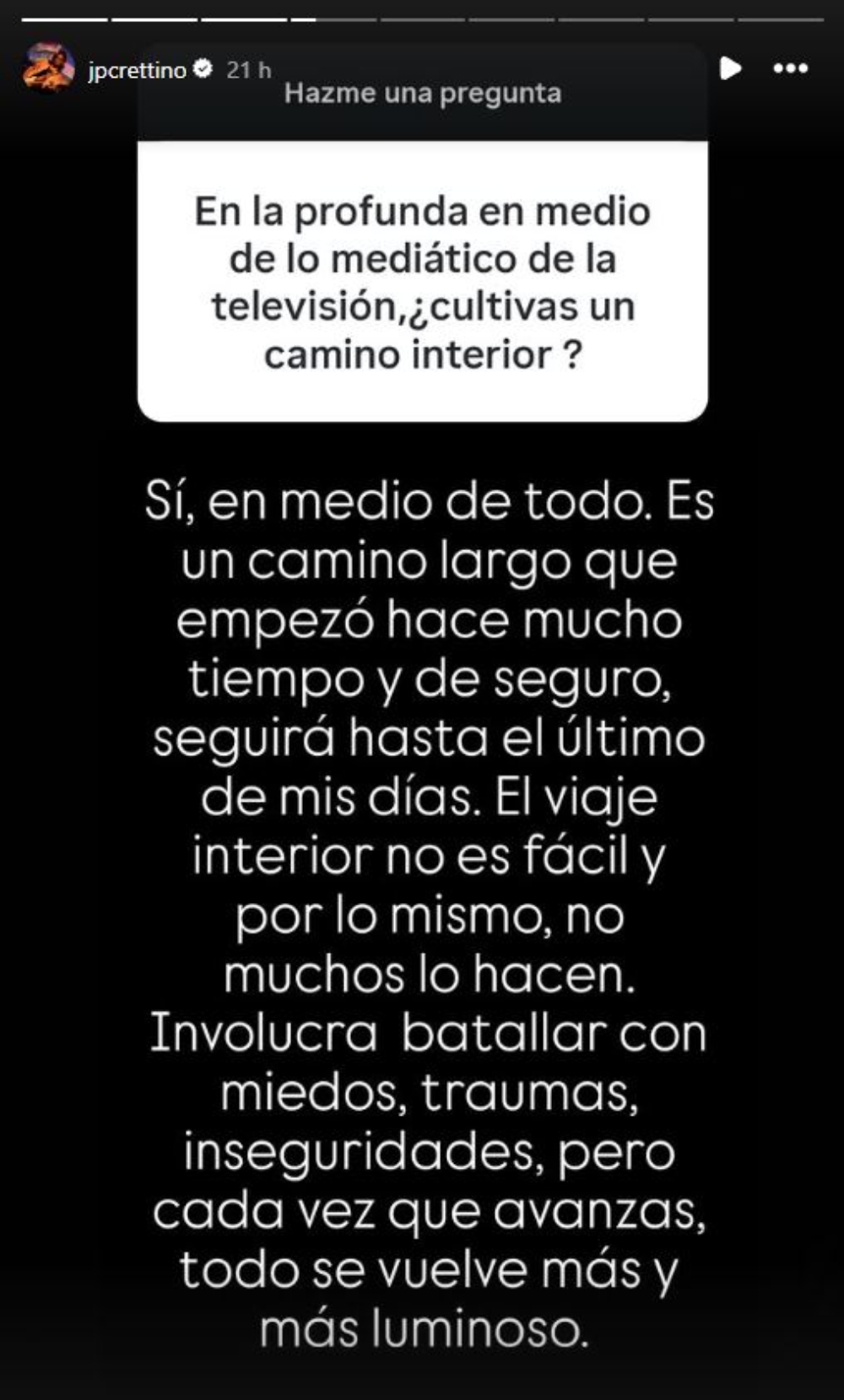 En sus historias de Instagram un usuario preguntó si, a pesar de su ajetreada vida, está cultivando un camino interior. Cretton inició diciendo: “Sí, en medio de todo. Es un camino largo que empezó hace mucho tiempo y de seguro, seguirá hasta el último de mis días”.