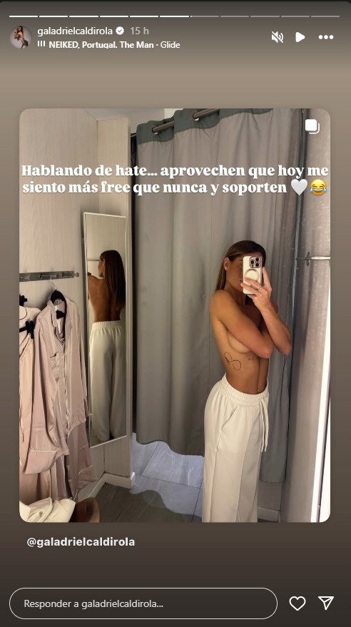 El descargo de la influencer no quedó allí, pues posteriormente subió a su historia una imagen donda posa frente a un espejo mientras se prueba ropa y escribió: "Hablando de hate, aprovechen que hoy me siento más free (libre) que nunca y soporten".