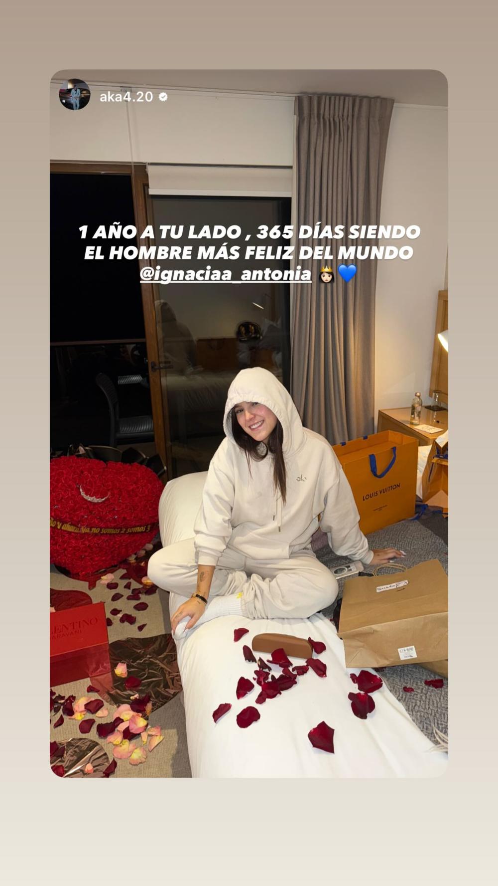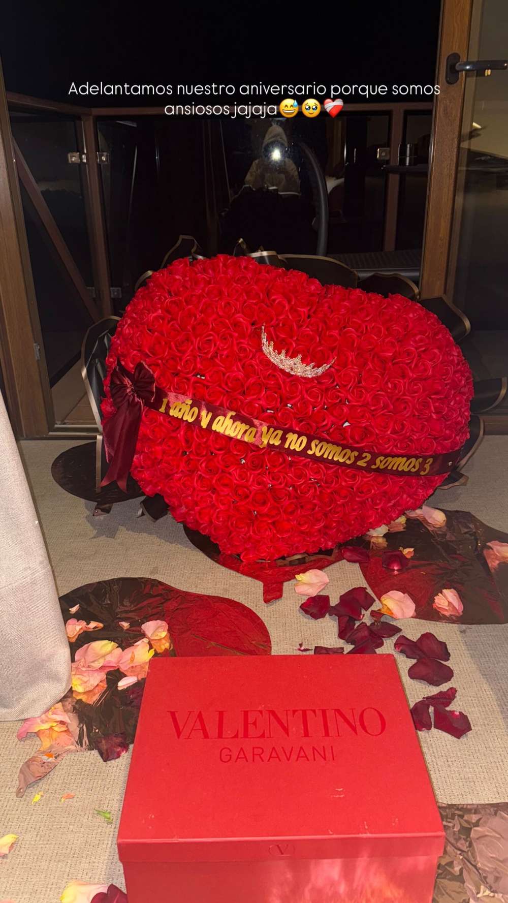 En sus historias, Ignacia mostró los regalos que recibió por anticipado: un ramo de rosas con el texto: “Un año. Y ahora ya no somos dos, somos tres”; y una caja de la marca italiana Valentino. “Adelantamos nuestro aniversario porque somos ansiosos”, explicó.