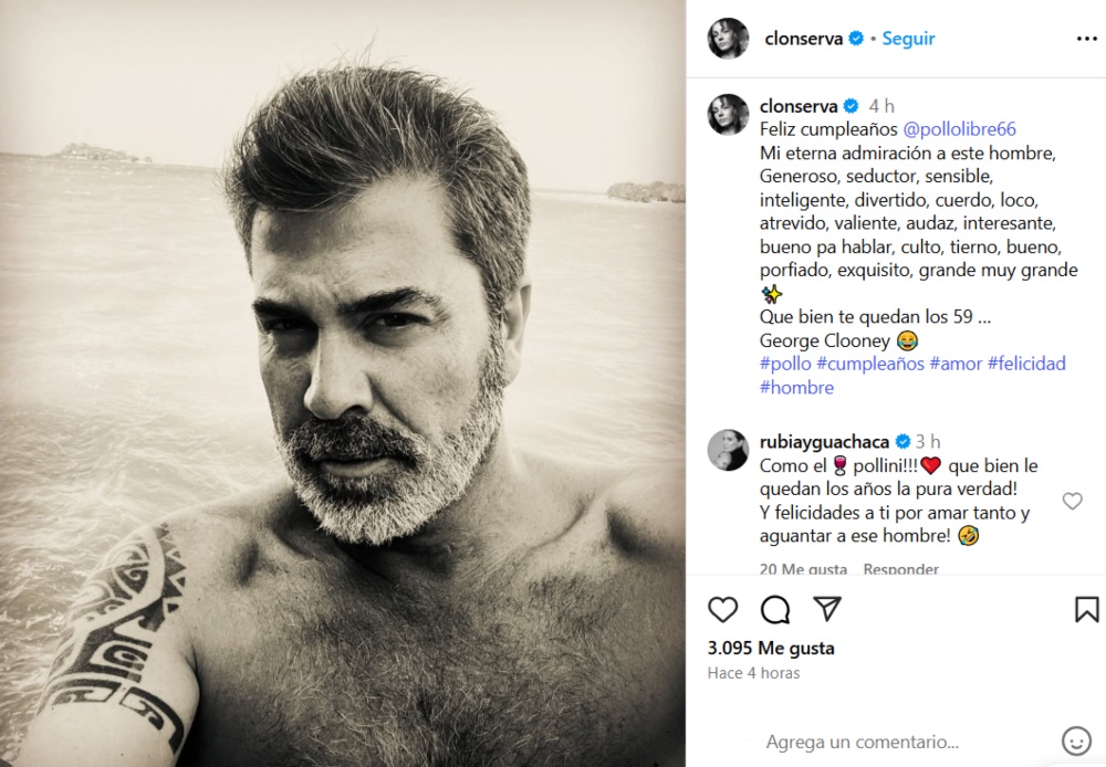 Fue mediante su cuenta de Instagram que la presentadora expresó su amor y aprecio por el "Pollo". “Feliz cumpleaños. Mi eterna admiración a este hombre generoso, seductor, sensible, inteligente, divertido, cuerdo, loco, atrevido, valiente, audaz, interesante, bueno pa' hablar, culto, tierno, bueno, porfiado, exquisito y grande, muy grande”, escribió.