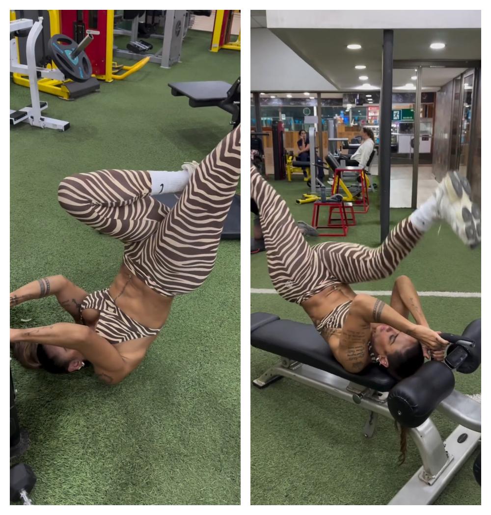 En su cuenta de Instagram, la polola de Arturo Vidal se mostró con un pantalón y top deportivos con estampado animal, ideal para brindarle comodidad al iniciar el entrenamiento con giros rusos con extensiones.