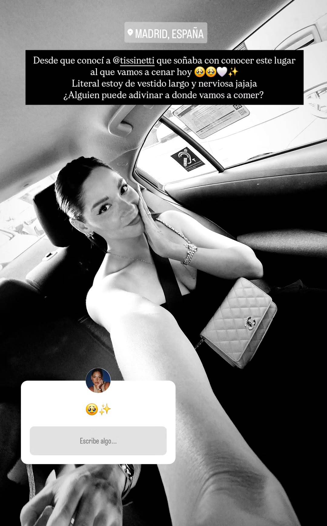 “Soñaba con conocer este lugar al que vamos a cenar”, escribió Kel. “Literal, estoy de vestido largo y nerviosa”, expresó en su post, desde el interior de un vehículo.