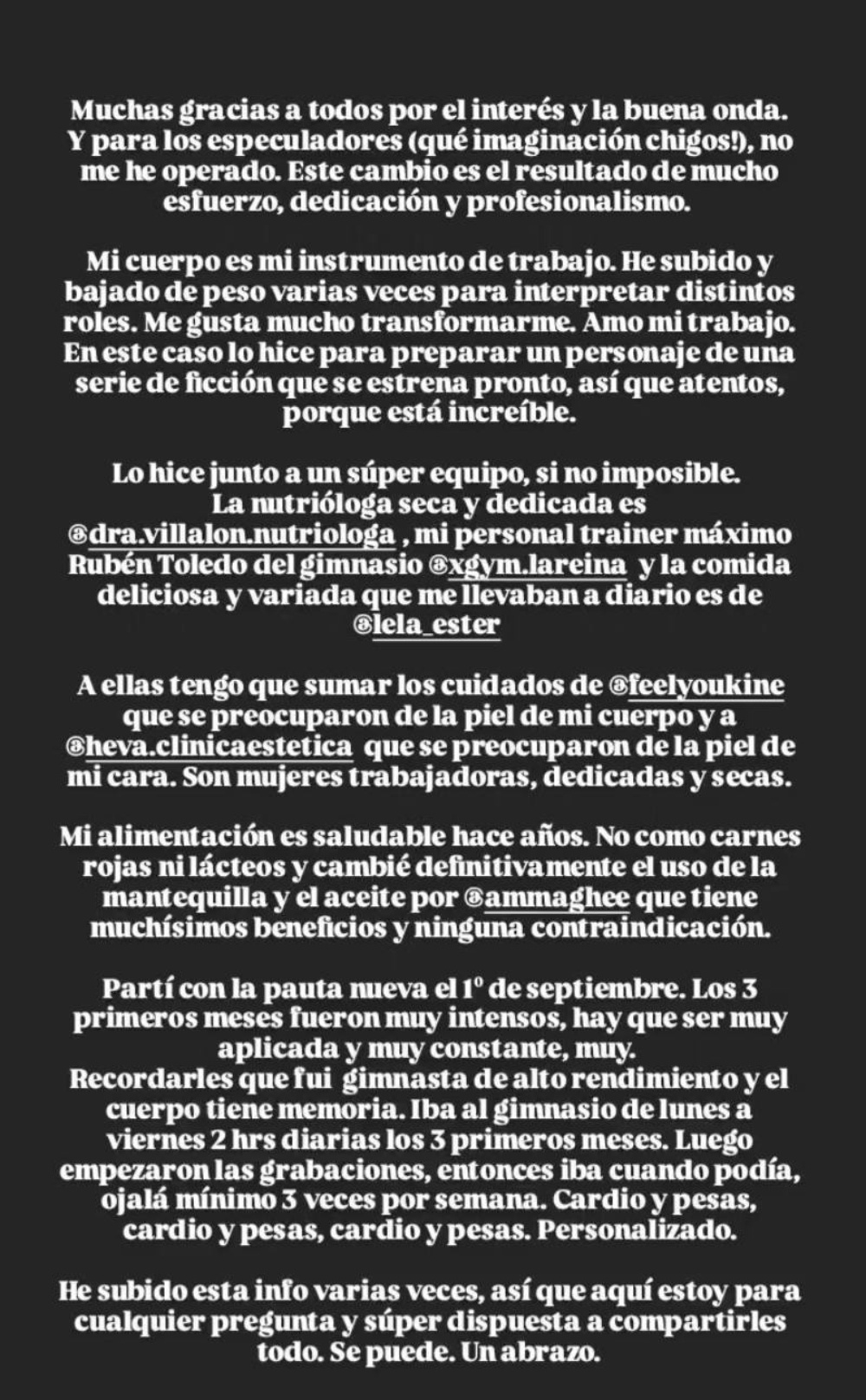 “Mi cuerpo es mi instrumento de trabajo. He subido y bajado de peso varias veces para interpretar distintos roles. Me gusta mucho transformarme. Amo mi trabajo. En este caso lo hice para preparar un personaje de una serie de ficción que se estrena pronto, así que atentos, porque está increíble”, reveló.