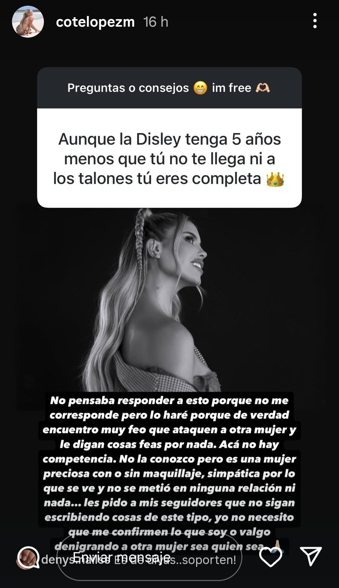 Sin embargo, López dejó saber su postura ante esta clase de juicios: “No pensaba responder a esto, porque no me corresponde. Pero lo haré, porque de verdad encuentro muy feo que ataquen a otra mujer y le digan cosas feas por nada. Acá no hay competencia. No la conozco, pero es una mujer preciosa con o sin maquillaje, simpática por lo que se ve y no se metió en ninguna relación ni nada".