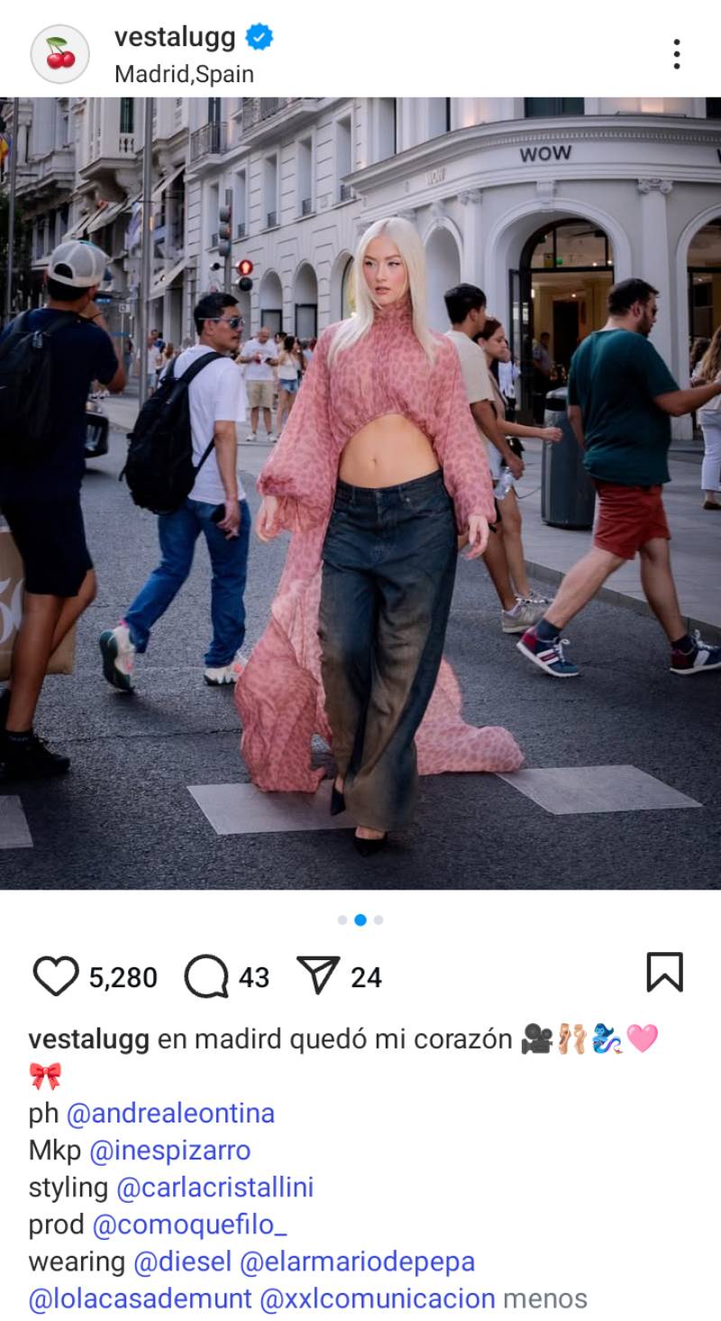 Madrid le regaló las mejores vibras a Vesta Lugg, quien totalmente inspirada lució un outfit mágico con un top que fluía y le daba un toque etéreo. La cantante toma las calles y las convierte en su mejor pasarela para desfilar la moda vanguardista.