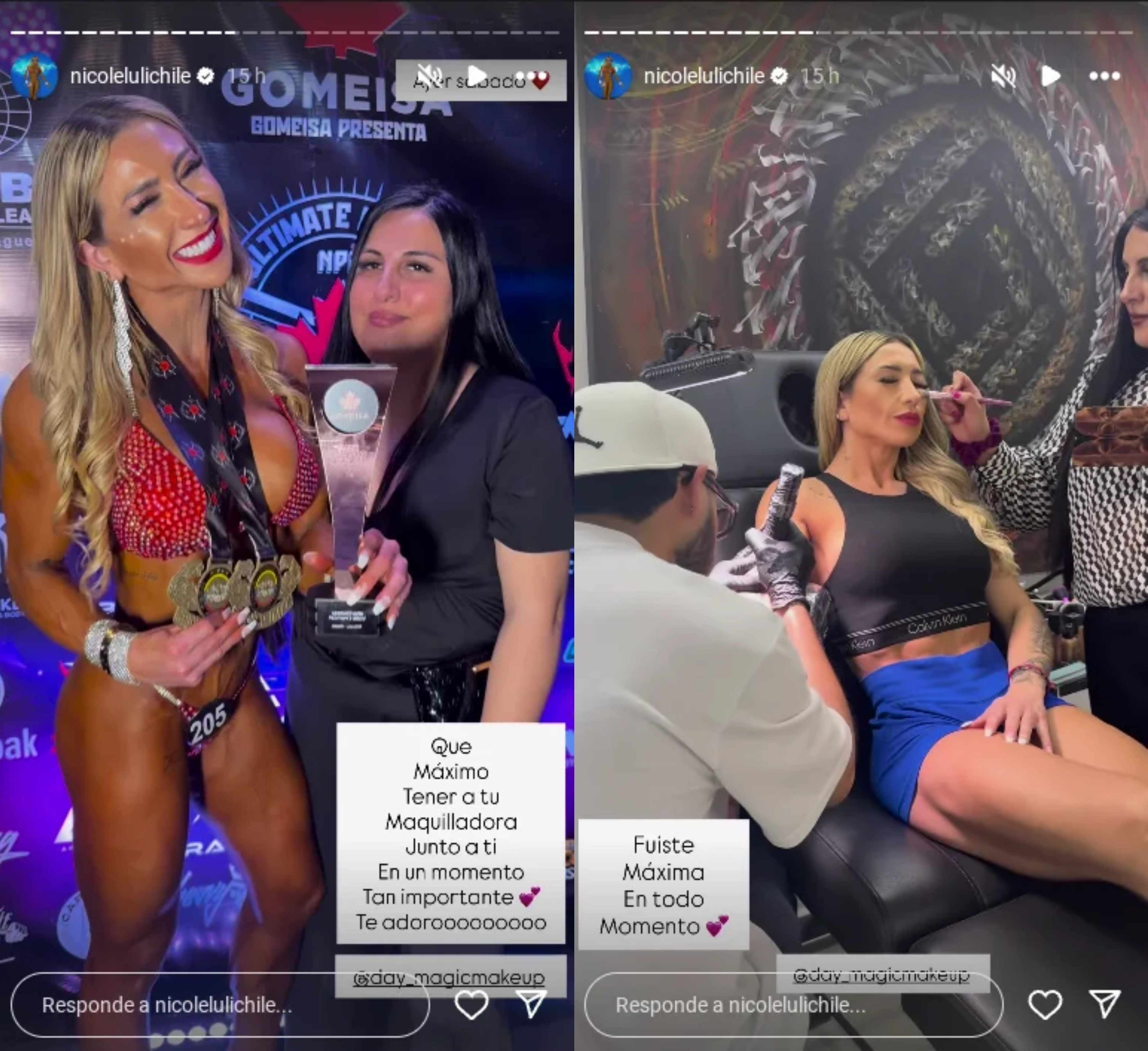 En su post, Nicole Moreno modela sus premios junto a su maquilladora, tras arrasar en las distintas categorías de la competencia. En otra foto, la culturista muestra cómo Day la maquilló antes de su turno en el escenario.