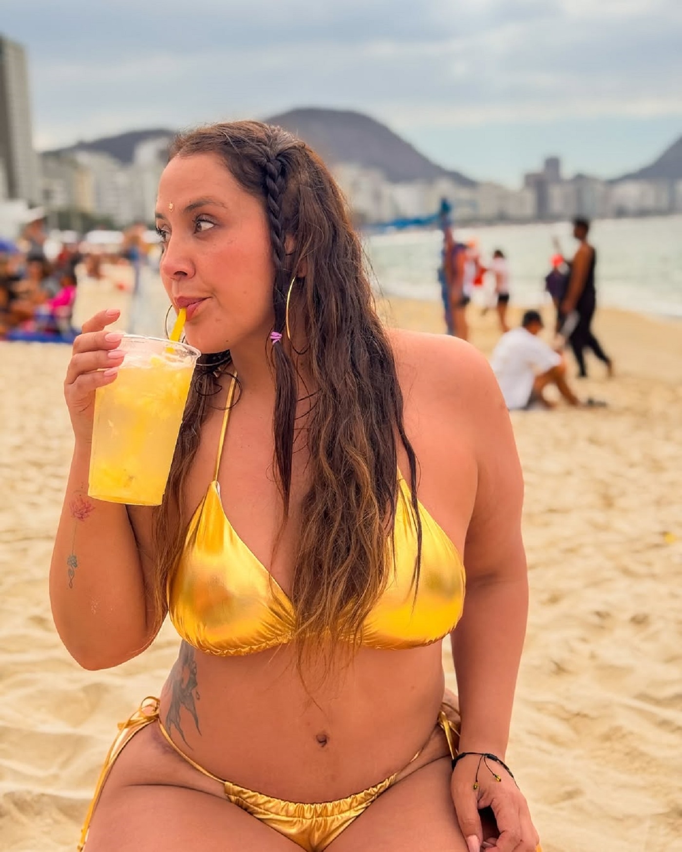 Horas después, la humorista sacó su lado más sensual y estrenó en Copacabana un bikini dorado. “Un corazón triste siempre se alegra en Brasil”, declaró en el post, que hizo reaccionar a sus fans.