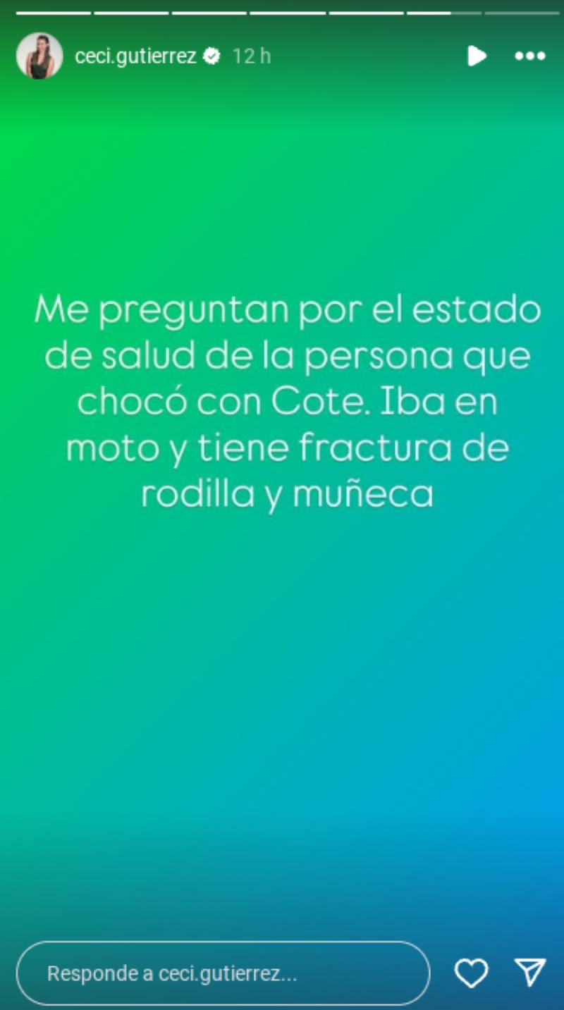 Horas después del accidente de tránsito, Cecilia Gutiérrez detalló en sus redes el estado de salud del motorista, mencionando que este tiene fracturas en la rodilla y la muñeca.