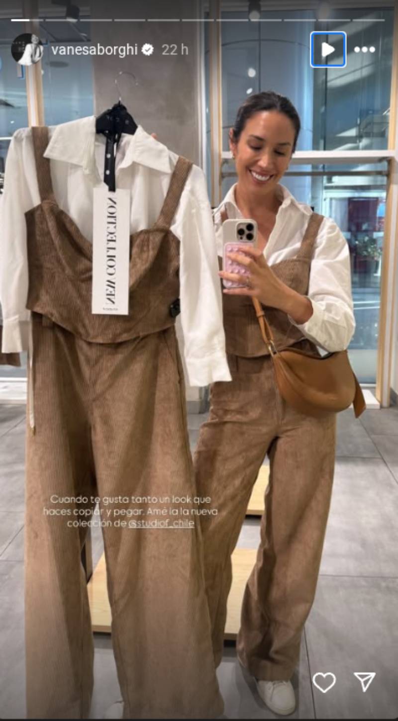 "Cuando te gusta tanto un look que haces 'copiar' y 'pegar'", escribió Borghi en una historia de Instagram, donde aparece posando con el mismo outfit que vio en la vitrina de una tienda y que terminó llevándose a casa.