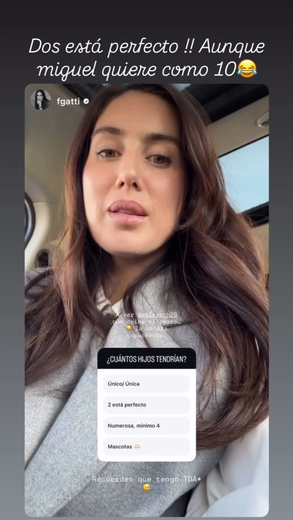 Fue allí cuando Valentina reveló las aspiraciones de su marido. "Dos está perfecto, aunque Miguel quiere como diez”, escribió entre risas la exgimnasta en el mismo video.