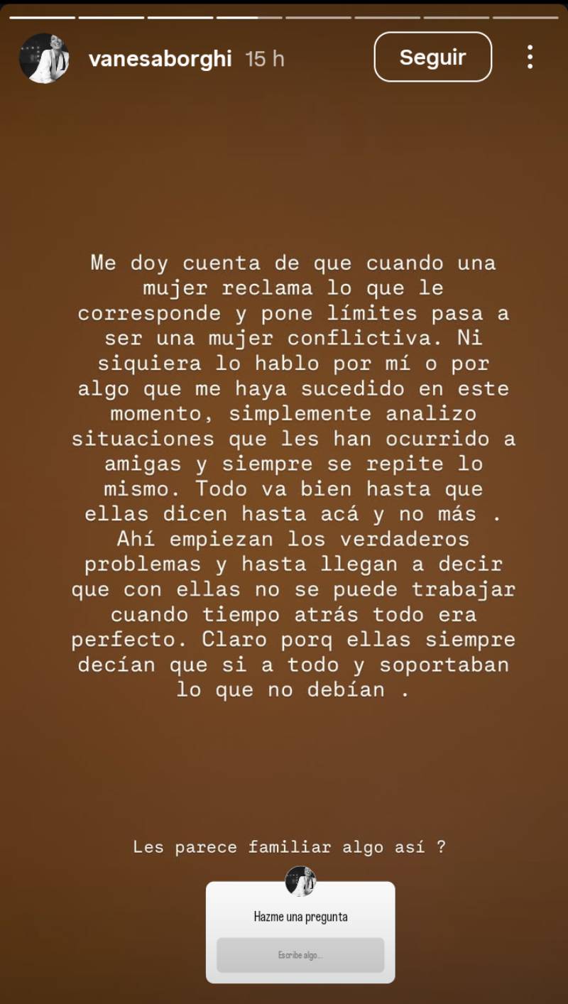 “Me doy cuenta de que, cuando una mujer reclama lo que le corresponde y pone límites, pasa a ser una mujer conflictiva”, indicó Borghi en la reflexión que compartió a través de una historia.
