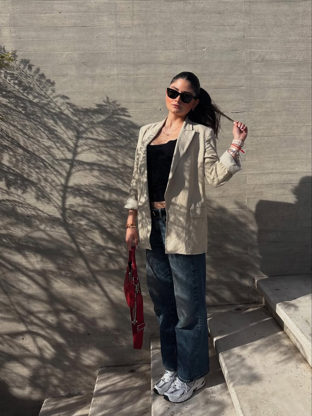 En este atuendo, la joven usó un cinturón negro, zapatillas deportivas blancas con detalles en gris y se arriesgó con un vibrante bolso rojo para romper la neutralidad de su propuesta.