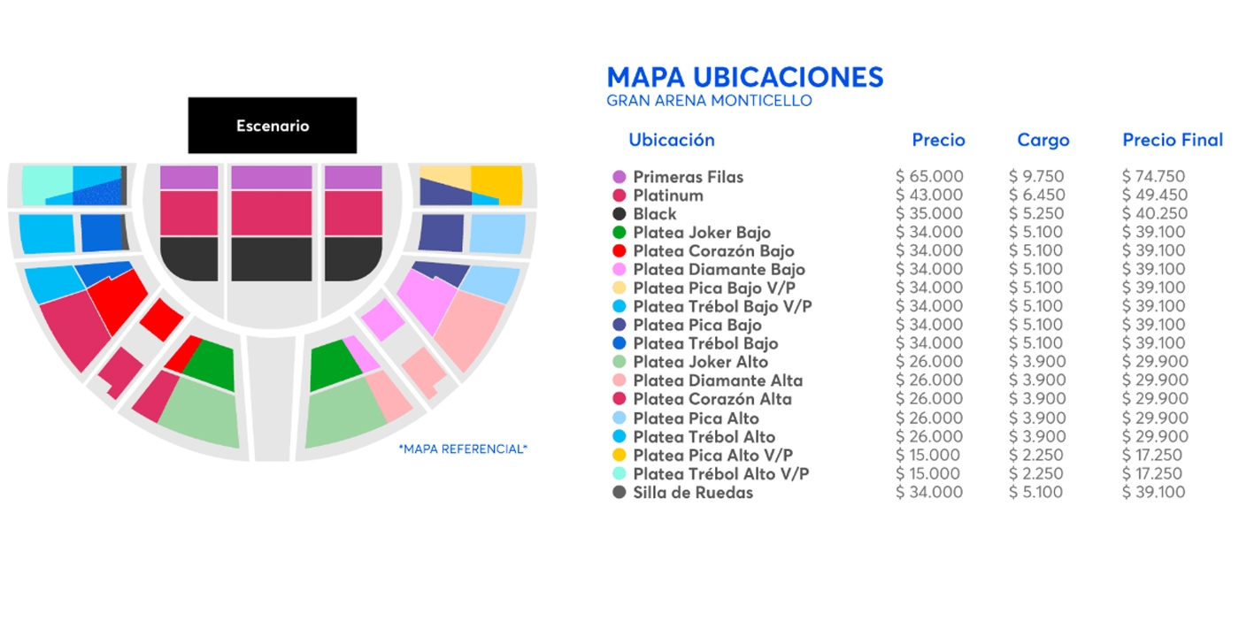 Los tickets van desde los $17.250 (Platea Trébol o Pica Alto) hasta los $74.750 (Primeras Filas).