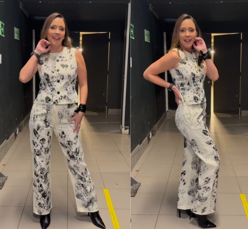 Y una de estas creaciones la llevó con elegancia, combinando una chaqueta sin mangas y botones al frente en color blanco, con un estampado abstracto en negro realizado a mano.