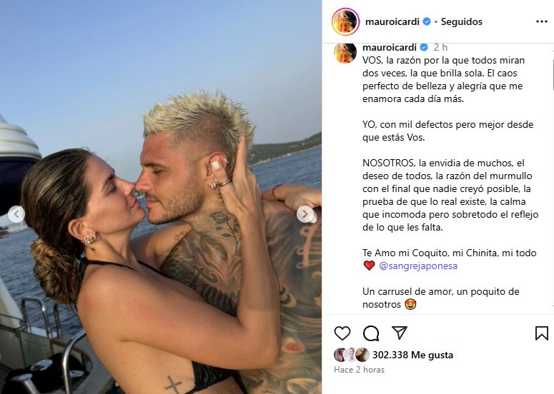 En primera instancia, Mauro Icardi declaró estar mucho mejor desde que están juntos: "Vos, la razón por la que todos miran dos veces, la que brilla sola. El caos perfecto de belleza y alegría que me enamora cada día más. Yo, con mil defectos pero mejor desde que estás vos".