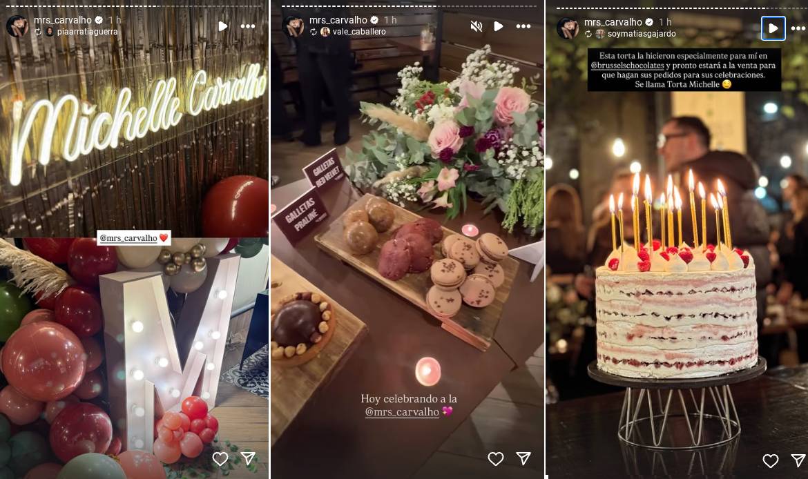 Carvalho festejó su fecha natal con estilo. Globos verdes, rojos y rosados, y su nombre escrito con luces sobre un muro, protagonizaron la elegante decoración del evento; mientras que en una mesa se exhibieron diversos postres y su delicada torta de cumpleaños, creado especialmente para ella con capas de crema y frambuesas.