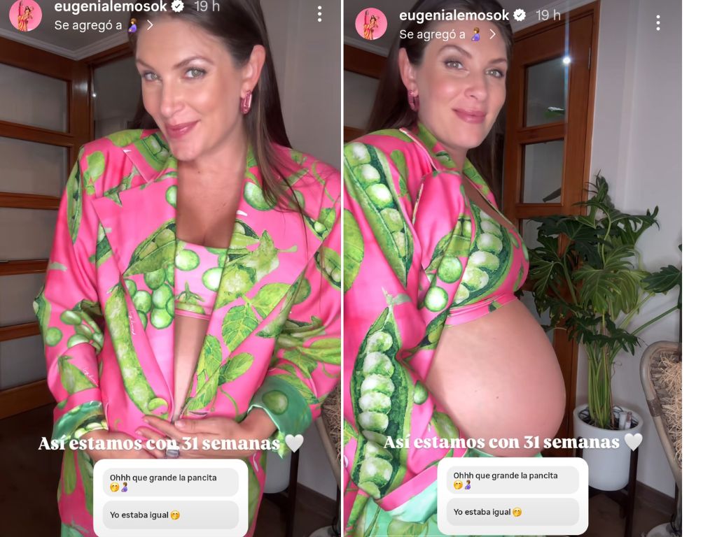 Dejando abierta la chaqueta y con un crop top del mismo print de su jacket, Eugenia Lemos dio pistas del avance de sus 8 meses de embarazo. Con esta imagen, decidió interactuar con su público sobre el desarrollo de su "pancita".