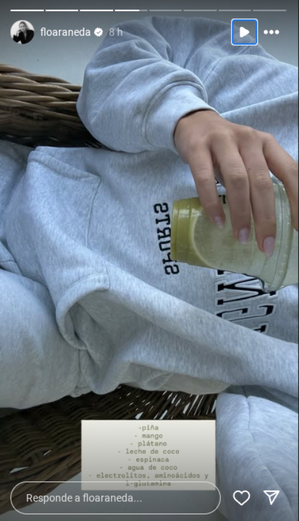En sus historias de Instagram, la modelo publicó una foto sentada en una silla de mimbre disfrutando de esta bebida que combina nutrientes esenciales.