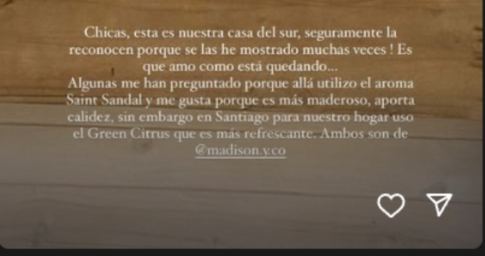 “Algunas me han preguntado por qué allá utilizo el aroma Saint Sandal, y me gusta porque es más amaderado y aporta calidez. Sin embargo, en Santiago para nuestro hogar uso el Green Citrus que es más refrescante”, contó.