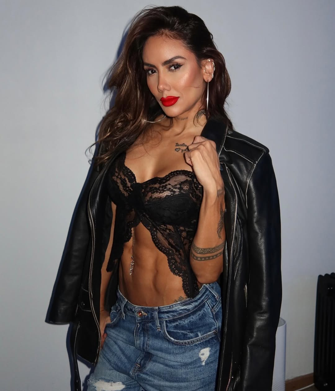 “Labios rojos, cuero y encaje”, fue como Sonia describió las fotografías. Luce un crop top de encaje negro -que deja al aire su abdomen- junto con una chaqueta de cuero y jeans rasgados para darle un toque urbano y casual a su look.