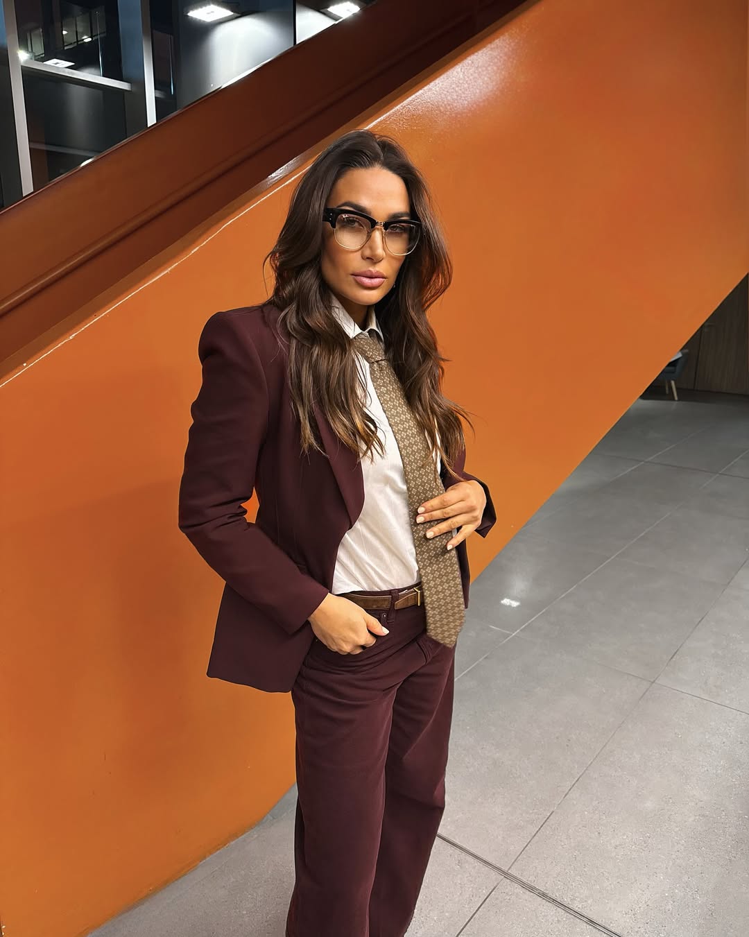 Lisandra compartió las fotos de su outfit en Instagram, donde luce un sofisticado traje sastre en color burdeos, combinado con una camisa blanca y una corbata de estampado clásico en tono marrón.