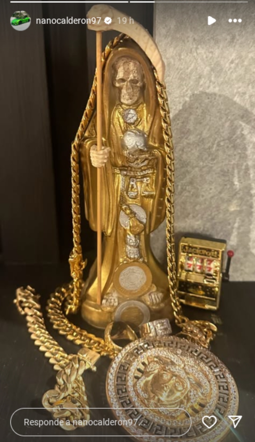 En sus historias de Instagram, el influencer de 28 años compartió una foto de varios artículos dorados que compró, entre los que destaca uno de la Santa Muerte.