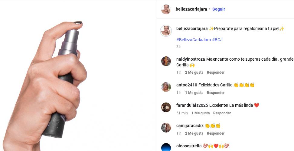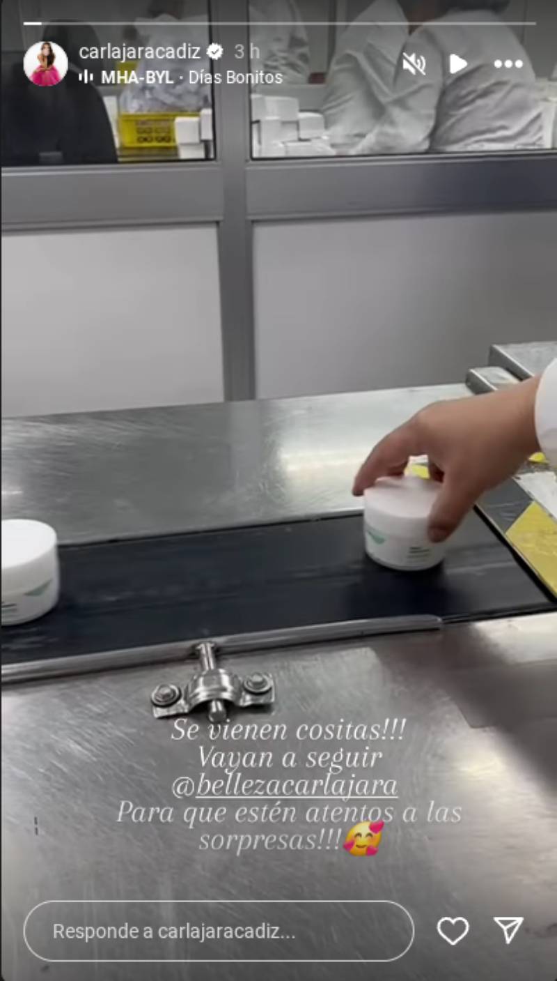 Carla también invitó a sus fans a seguir la cuenta oficial de su emprendimiento, @bellezacarlajara, donde ya tiene sus primeras publicaciones. En una, se muestra un envase con atomizador junto a la descripción “prepárate para regalonear tu piel”.