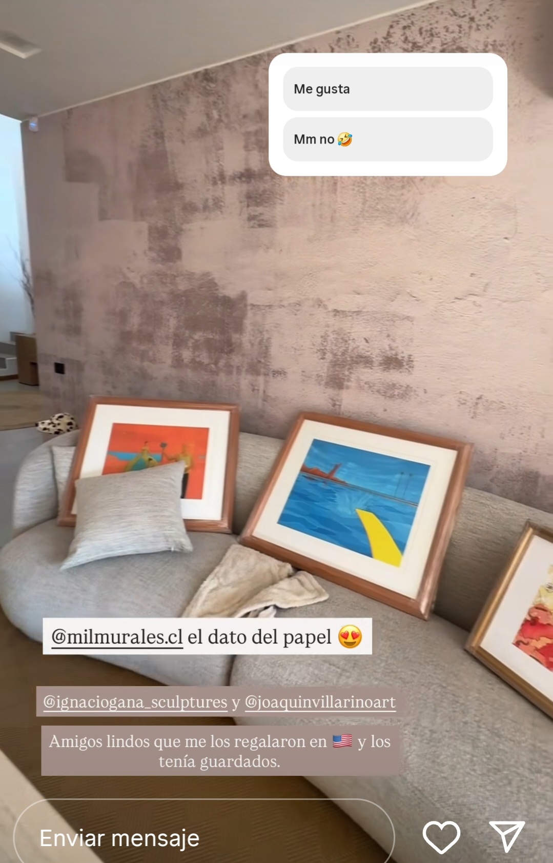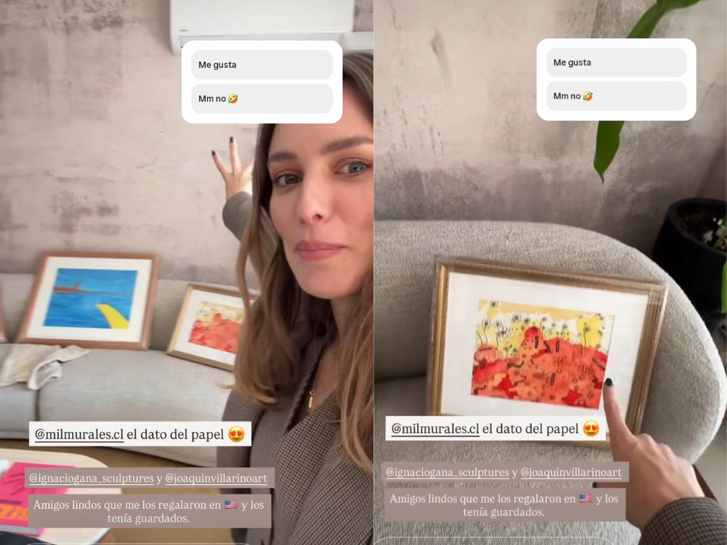 “El papel mural está listo... los cuadros ya los enmarqué, esos me los traje de los Estados Unidos. Este es de Ignacio Gana, amigo mío; este de Joaquín Villarino. Los tenía enrolados, los tenía que enmarcar”, expresó complacida.