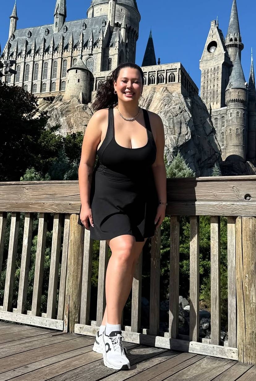 Teniendo el castillo de Hogwarts de fondo, Michelle Carvalho posó con el diseño deportivo más trendy de la temporada, con líneas rectas limpias y un textil ligero que dibuja un minivestido enterito con corte en la cintura.