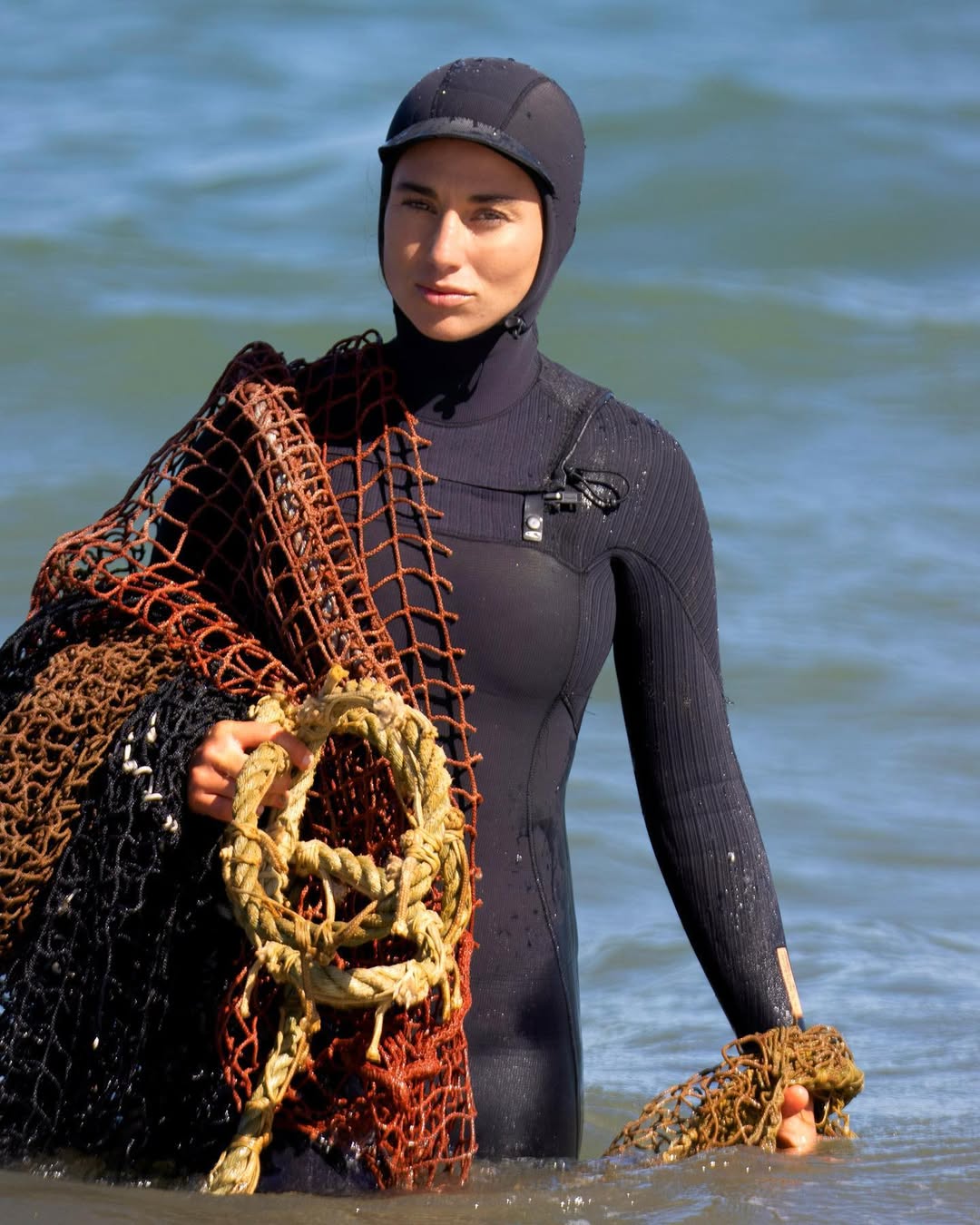 La periodista recibió su invitación poco antes de ir a bucear para un programa de televisión. Al sumergirse en el mar, halló enredado en un neumático el material perfecto para su atuendo: una red de pesca.