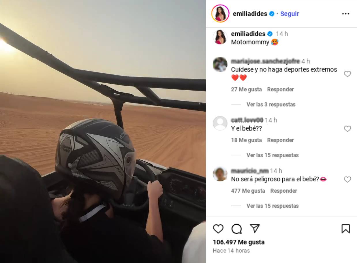 "Cuídese y no haga deportes extremos"; “¿Y el bebé?”; “¿No será peligroso para el bebé?”, comentaron algunos ante el temor de que este tipo de actividades represente algún riesgo para su futuro hijo. Otra seguidora expresó: “Jajaja, disfruta, Emi, pero cuídate ya, queremos verlos felices”.
